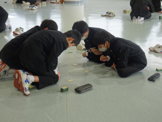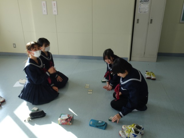 国語の時間、ランチルームで取り組みました。国語科の先生の読む札に、各グループで真剣に札を取り合います。大きな歓声がランチルームに響きます。