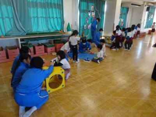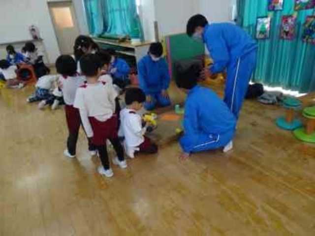家庭科の授業で、自分たちがつくった遊具を持っていきました。
