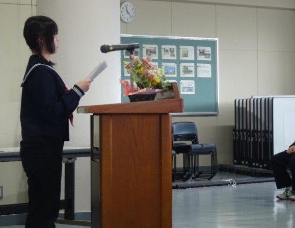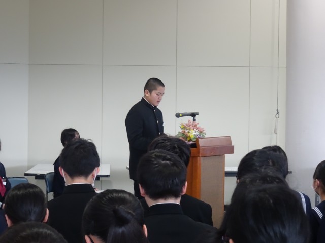 3年生代表は、受験勉強で工夫したこと、学年委員として頑張ったことを話しました。3年生が放課後の学習に集中できるよう、タイマーを設置したり、声かけをしたりしたこと。