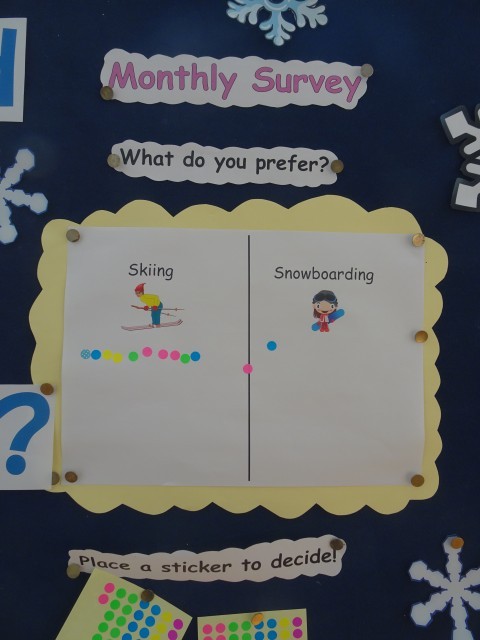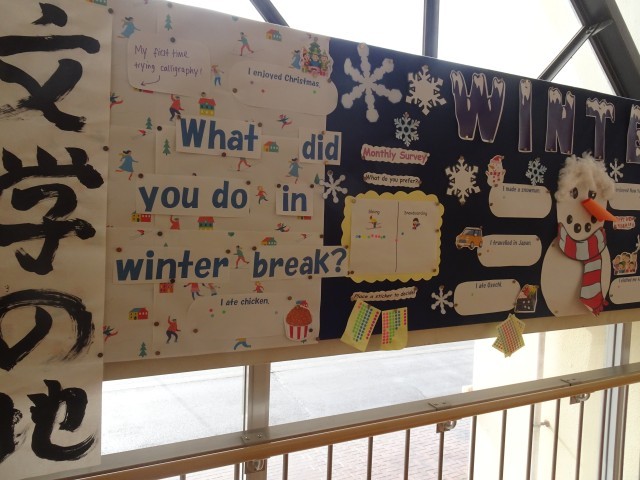 写真真ん中、下は、階段の踊り場。ALTの先生が、挑戦した書初作品と「スキー、スノボあなたはどっち?」と英語でのクエスチョンに答えるものになっています。