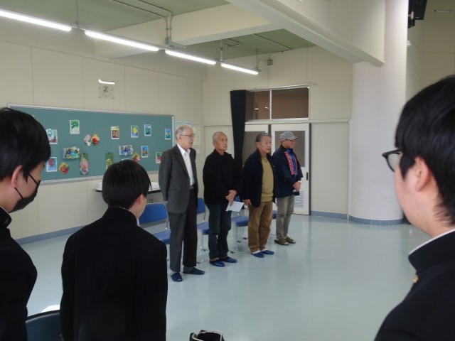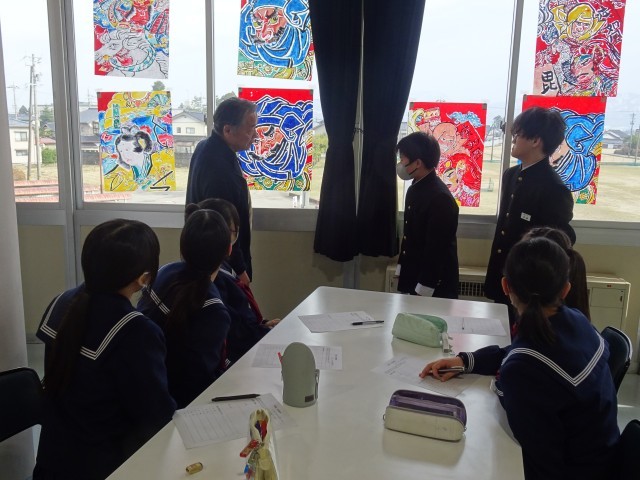 2学期に取り組んだ武者絵制作。完成作品を教えてくださった地域の指導者の方に、講評していただきました。