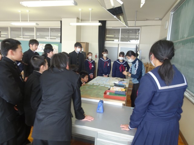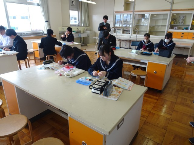 家庭科で、ボタンを布に付ける縫い方を習っています。