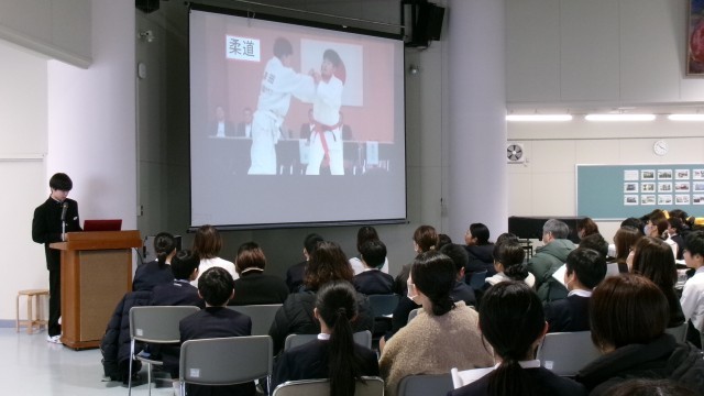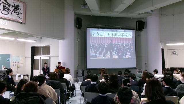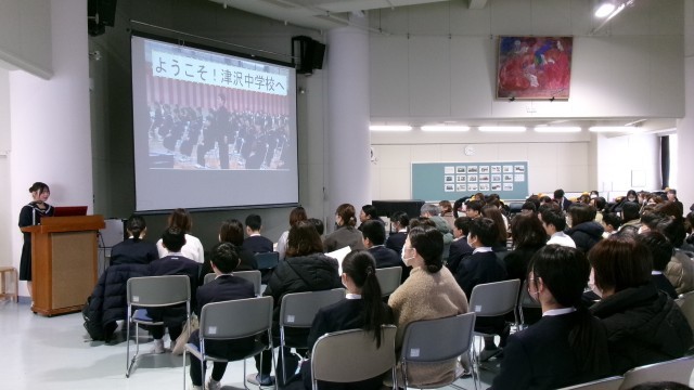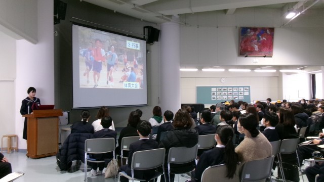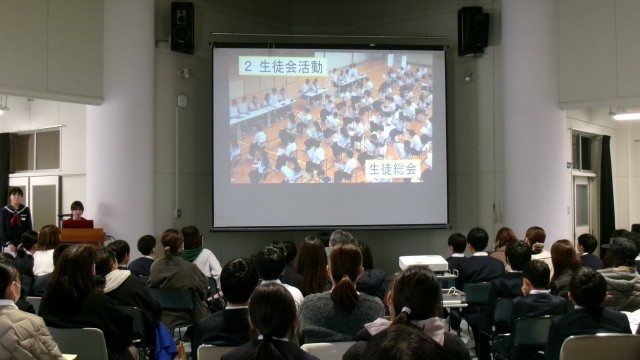 生徒会執行部から学校生活の説明を行いました。普段の学習から生徒会活動、学校行事、部活動など、たくさんのことを紹介しました。