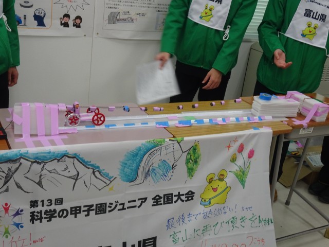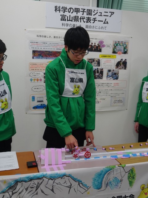 「磁石の磁界とマシンに流れる電流の力を利用して、どれだけ重いマシンをどれだけ遠くまで動かせるか」という課題に、県内の中学校から選ばれた6人が挑戦しました。