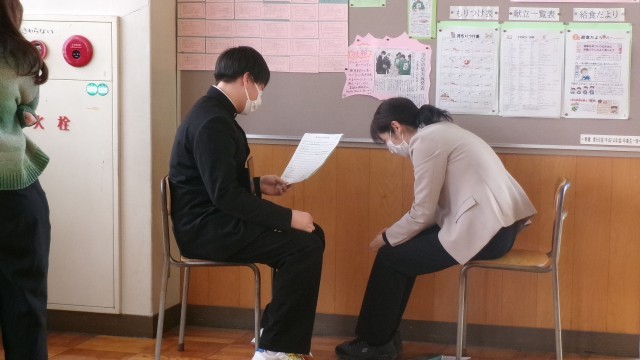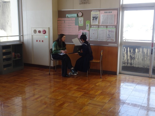 今日は英語の教員、ALT、教頭、校長に、ひとりひとりが、タブレットにキャラの映像を映し出しながら、英語で伝えました。