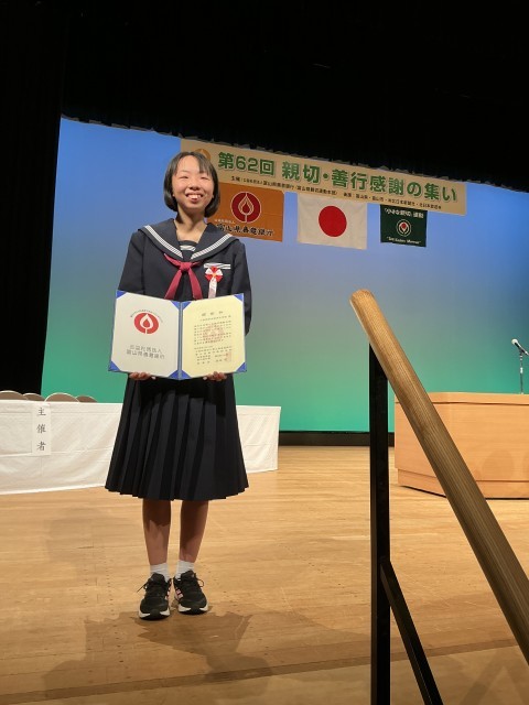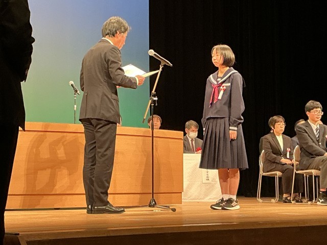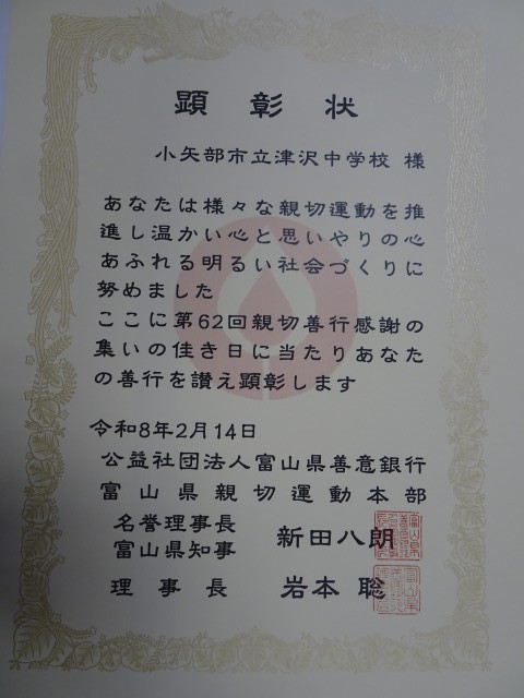 津沢中学校は、学校として2年間取り組んできた「親切運動」「地域清掃ボランティア」「給食時のゴミ減量」による表彰を受けました。