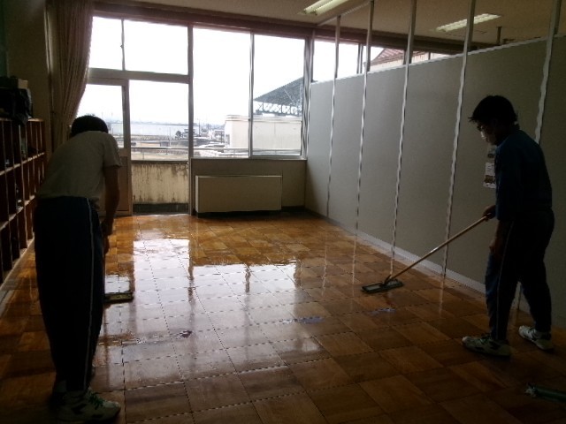 いつも使っている教室を、洗剤でを撒いてスポンジでゴシゴシとこすり、汚れを浮かせました。それをバキュームで吸い込だあと、きれいに水拭きをしました。