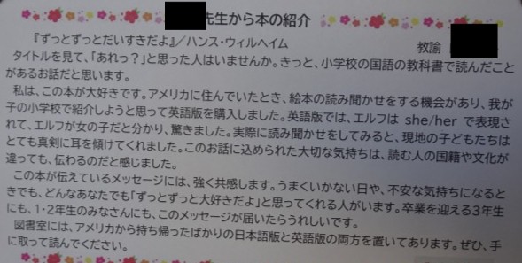 図書室には、先生からのおすすめ本の紹介コーナーもあります。