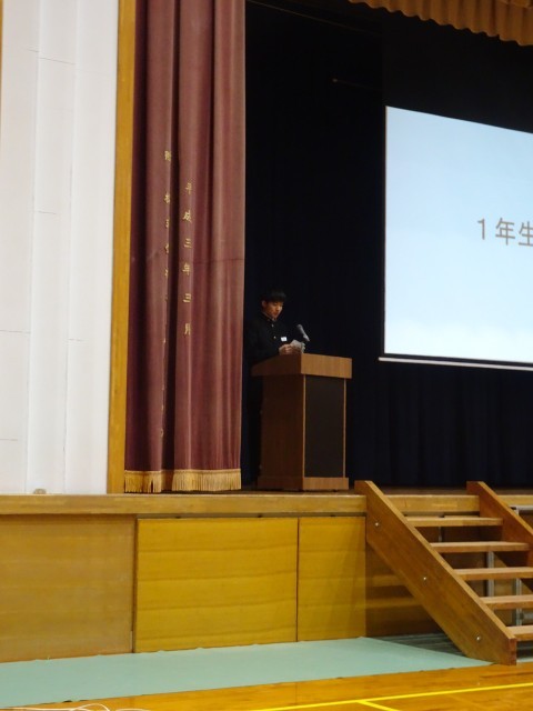 1年生の出し物です。学年委員長が「3年間の思い出をクイズにしました」とあいさつしました。