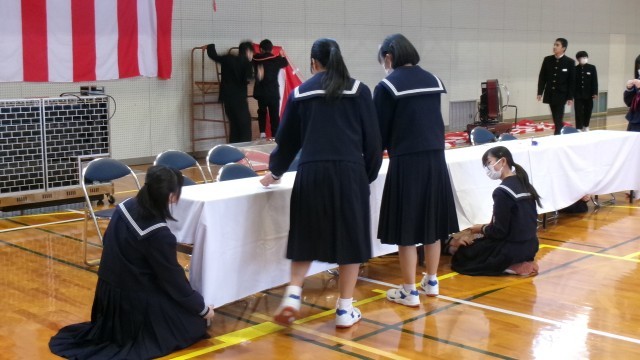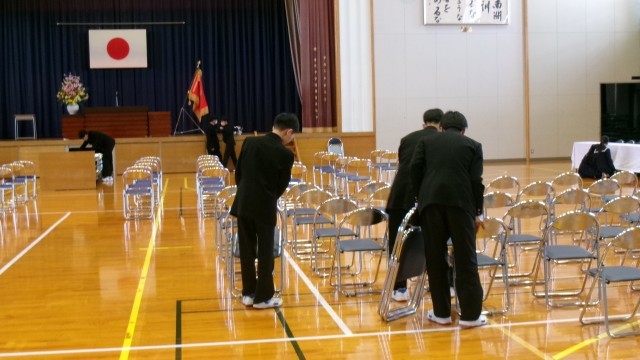 明日入学してくる新入生が気持ちよく式を迎えられるように、丁寧に作業を進めています。