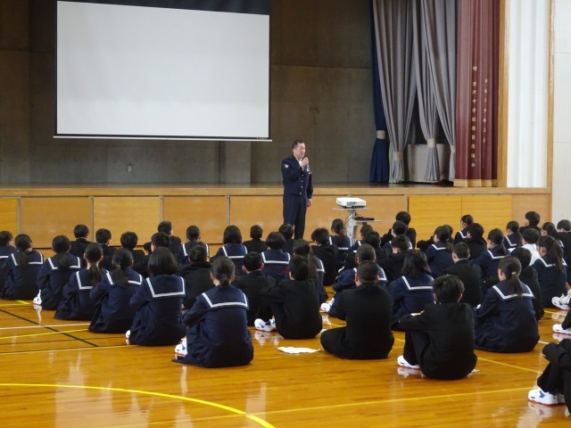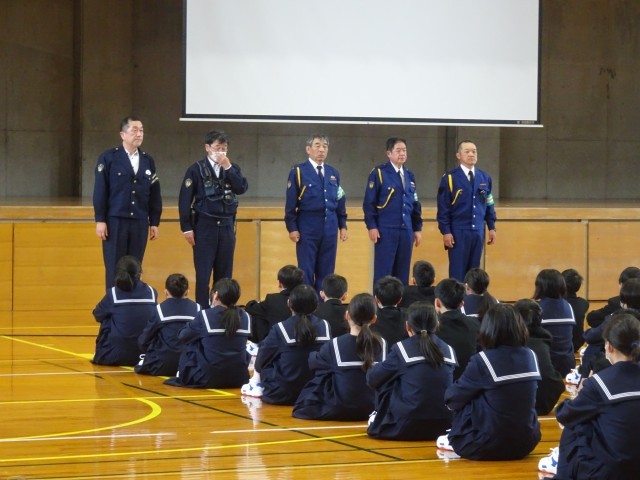 津沢、水島の駐在所の警察官、交通指導員を招いて、全校で交通安全教室を開きました。