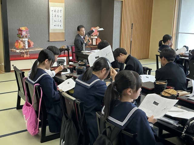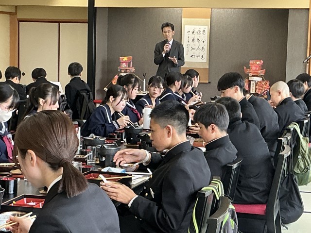 砺中さんで昼食をとり、(株)島津 代表の島津さんから、職業に関する講話を頂いています。