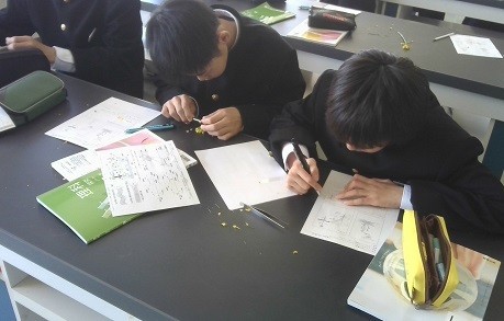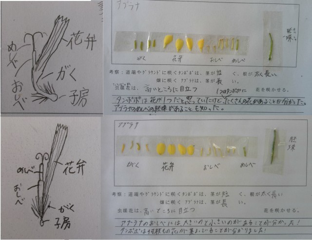 タンポポやアブラナを観察し、スケッチしたり、花を解体して貼り付けたりしながら、花のつくりを学習しました。「花にはいろいろな部分があり、虫に見つけてもらう、花粉を作るなど、それぞれの役割があることが分かりました。」「めしべの中には卵のような玉が沢山あると知った。胚珠というのを初めて知った。」「植物には様々な戦略があるということが分かった。」など、いろいろ考えながら観察を進めていました。