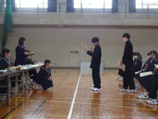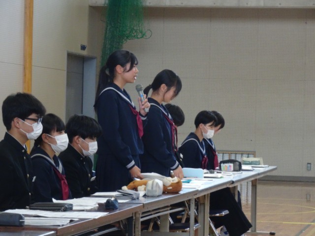 生徒会目標について、2年生から「自立と共助を並べるのは、はちょっと矛盾しているのでは」「失敗をおそれてしまうみんなにアドバイスを」などの質問や意見がありました。執行部がその思いを受け止めながら、テーマに込められている思いを伝え合いました。