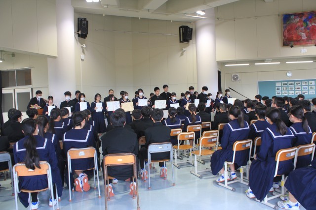 2学期終業式を行いました。受賞報告では、多数の生徒が特別活動に参加したと同時に実りある活動の成果が伝わりました。生徒意見発表から、中学校生活を全うし充実していた2学期であったことがよく伝わりました。経...
