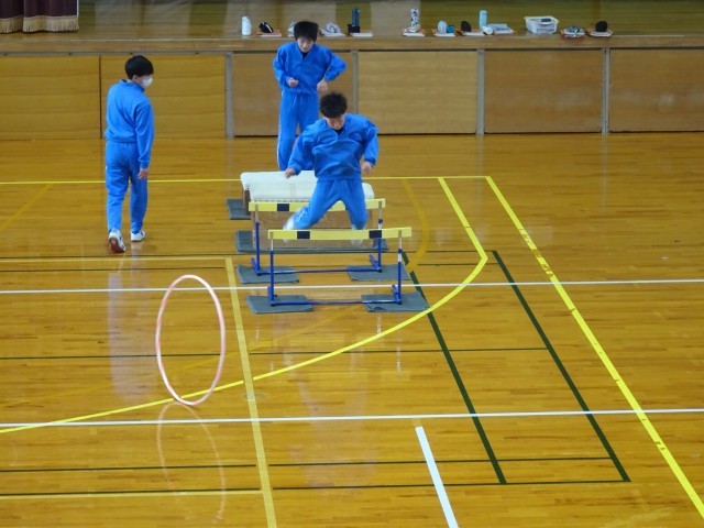 体育の授業では、体力作りに取り組んでいます。50秒ごとにグループで、それぞれのエクササイズに取り組んで、体育館を周ります。冬は、バス通学になったりと運動不足になりがち。しっかりと体力トレーニングに励み...