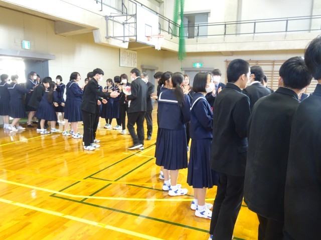 5名の先生の離任式をしました。代表生徒がそれぞれの先生に手紙とは花束を渡しました。「エネルギッシュな先生にパワーをもらいました」「分かりやすい授業といつも優しく指導してくださって、ありがとうございまし...