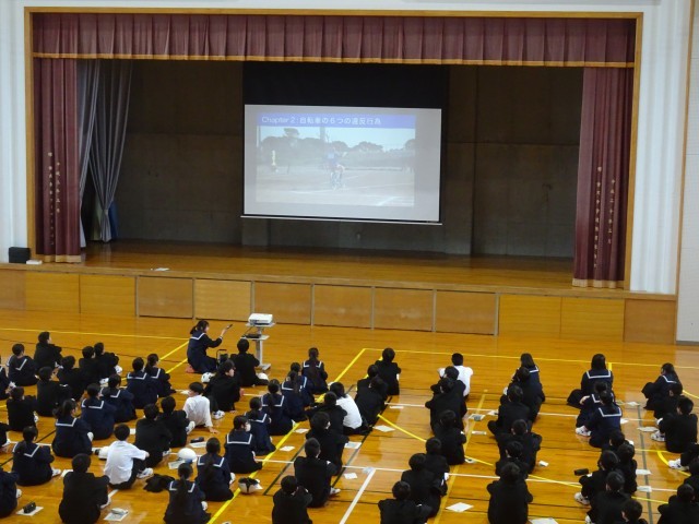 津沢、水島の駐在所の警察官、交通指導員を招いて、全校で交通安全教室を開きました。規律委員長が、校長室から体育館へ案内しました。まず警察の方から、「交通ルールを守らないと命に関わること」「16歳を迎える...