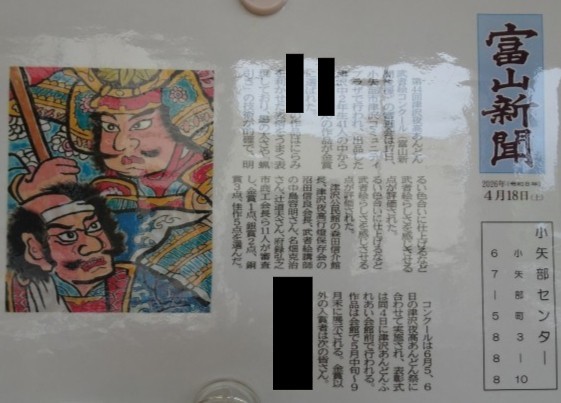 先日の武者絵コンクールの結果が、富山新聞さんに掲載されました。小矢部センターの方が、ラミネートにして持ってきてくださいました。職員室前に掲示しています。