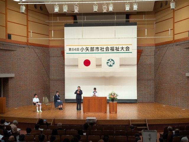市内中学生の社会福祉に関する作文の募集において、本校生徒が最優秀者として選ばれました。今日この会で表彰を受けるとともに、作文の朗読を行いました。生徒は、思いやりの心を綴った作文を堂々と読み上げていました。