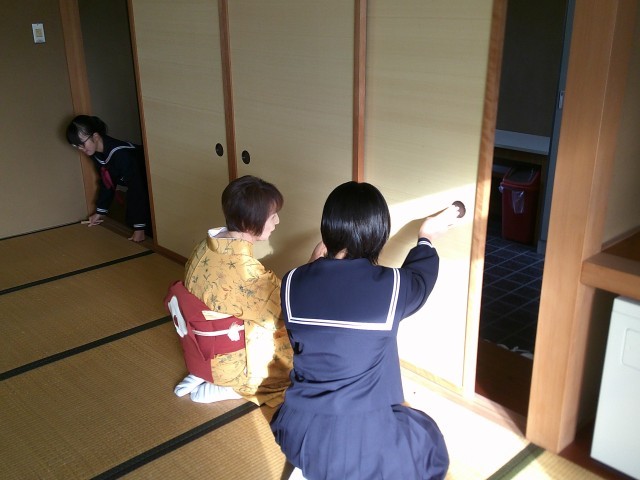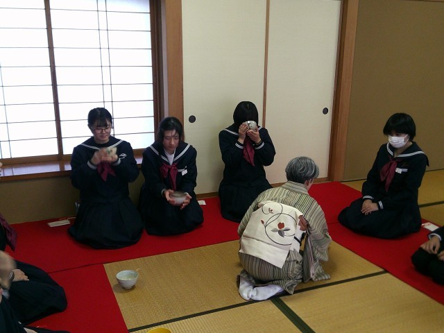 茶道クラブでは、和室への出入りを教えていただいたのち、お菓子、抹茶をいただきました。