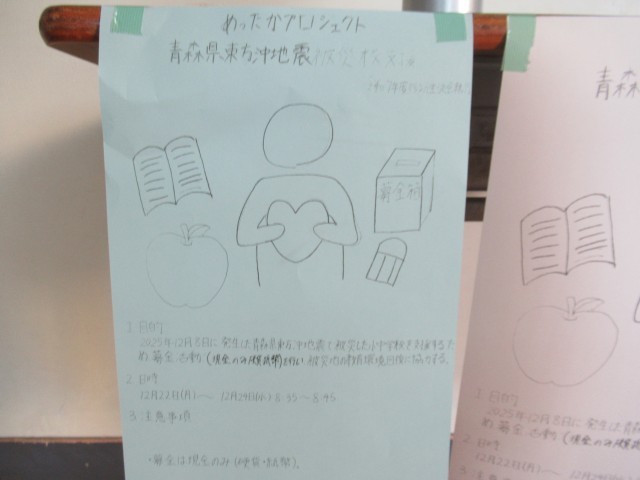 この取組は、令和7年度後期生徒会執行部が企画したもので、12月8日に発生した青森県東方沖地震で被災した小中学校を支援することを目的としています。被災地の教育環境を少しでも早く回復できるよう、全校生徒と教職員が協力して募金活動を行っています。