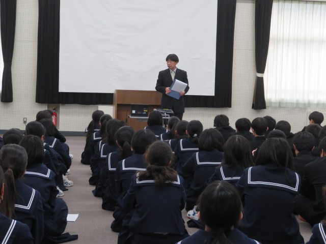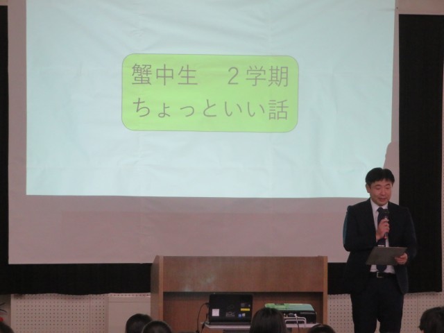 校長先生からは、「蟹中生 2学期ちょっといい話」として、学校内での様々な蟹中生の様子が紹介され、全校で共有しました。
