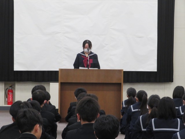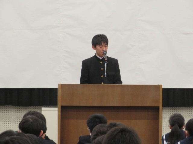 進路学習を通じて自分の進路や将来について考えたこと、間近に迫った部活動のコンテストへの意気込み、3年生からは今まで一緒に過ごしてきた仲間との残りの学校生活のことなど、それぞれの思いがこもった発表でした。