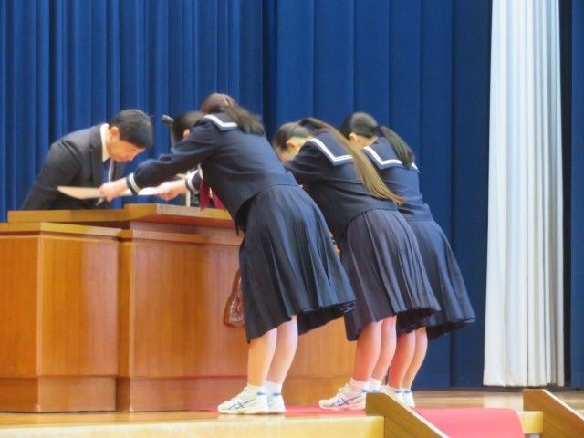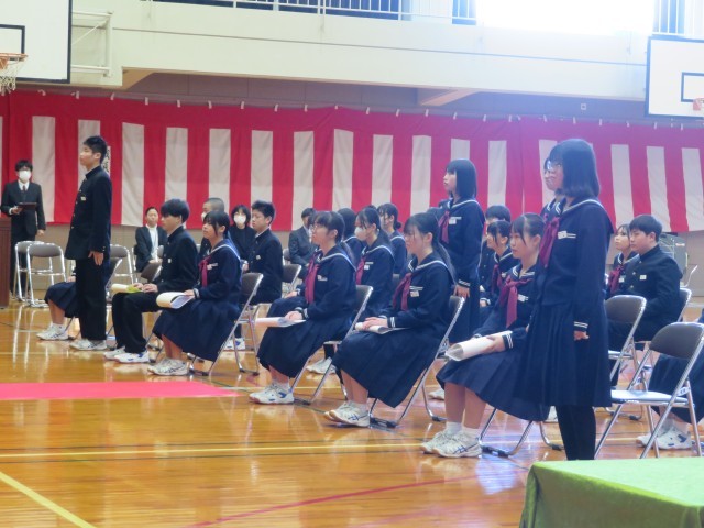 義務教育9年間欠席しなかった生徒、中学校3年間欠席しなかった生徒へそれぞれ精励賞が贈られました。