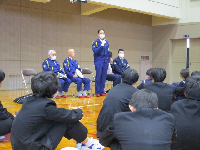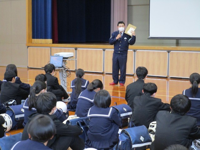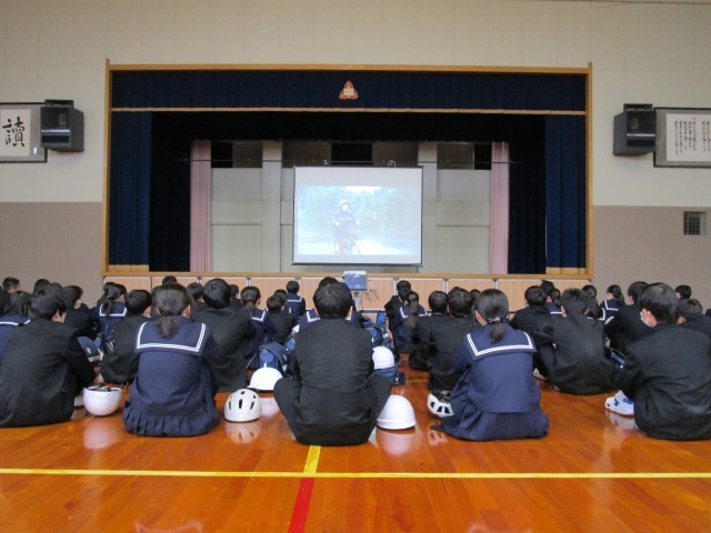 あいにくの雨だったので、自転車に乗っての実習はせず、体育館でお話を聞きました。