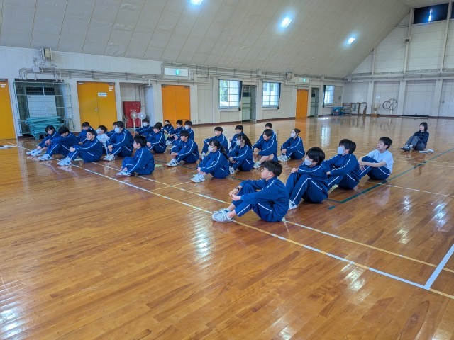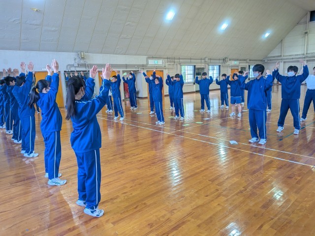 2日目の活動が始まりました。朝のつどいで運動をしています。午前は野外で活動します。