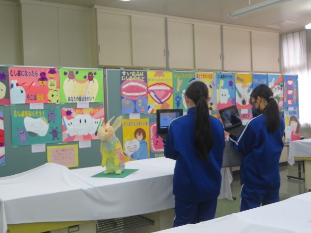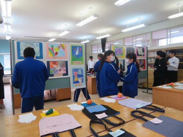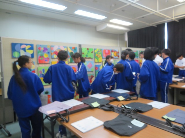 それぞれの学年が技術・家庭・美術の授業で制作した力作を鑑賞し、タブレットを使って感想を入力しました。