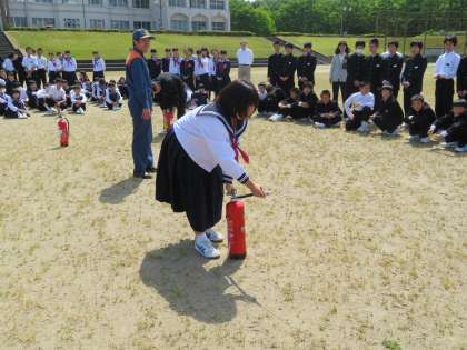 今日、避難訓練を実施しました。生徒は、避難指示を受け、速やかに避難しました。その後、水消火器を用いて、代表生徒が消火訓練を行いました。