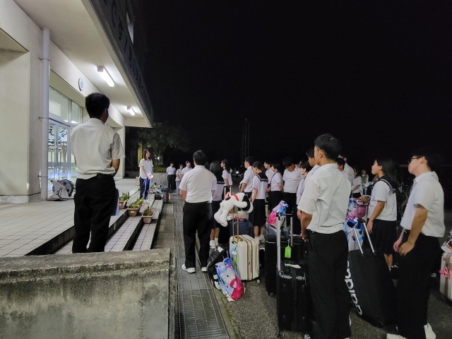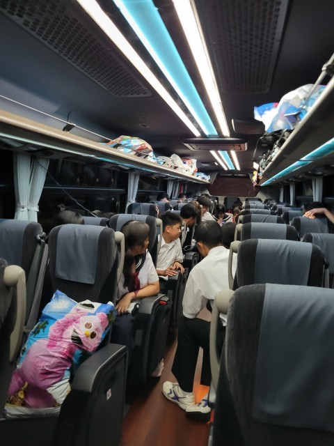バス内で帰校式を行い、学校に帰ってきました。