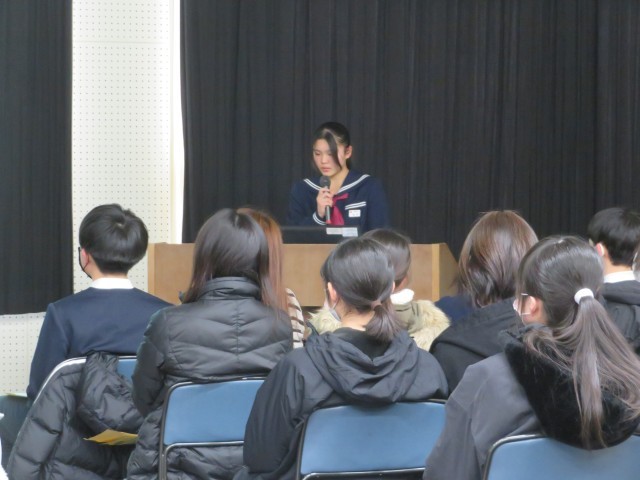 進路学習を通じて自分の進路や将来について考えたこと、間近に迫った部活動のコンテストへの意気込み、3年生からは今まで一緒に過ごしてきた仲間との残りの学校生活のことなど、それぞれの思いがこもった発表でした。