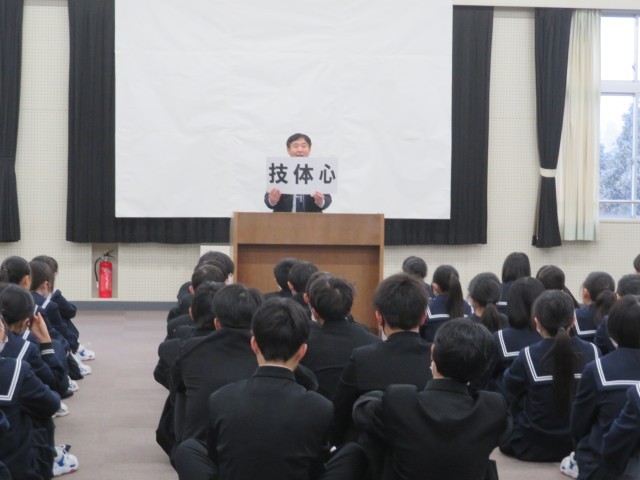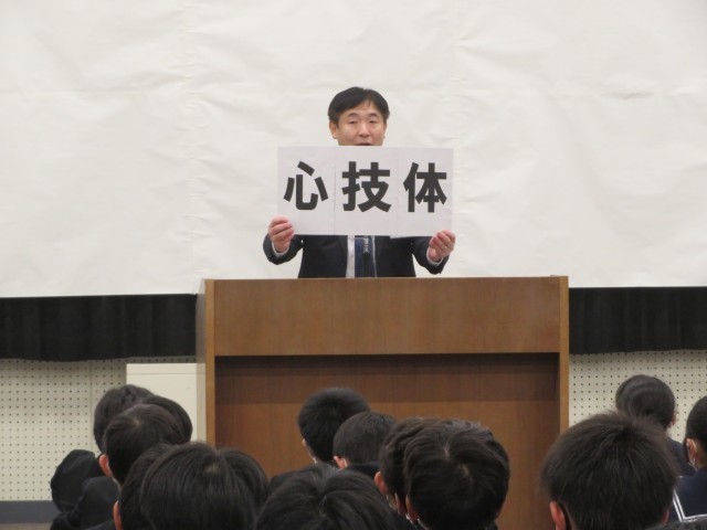 校長先生から、箱根駅伝で優勝した青山学院大学の原監督の言葉を題材として、「技体心」で半歩先の目標を大切に取り組むことの話がありました。
