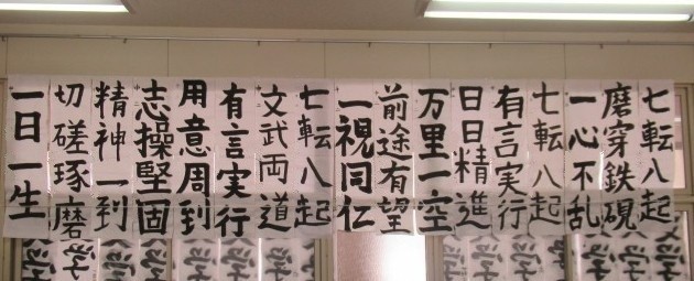 2年教室に、冬休みの課題「新年の目標を四字熟語で表そう」を掲示しました。
