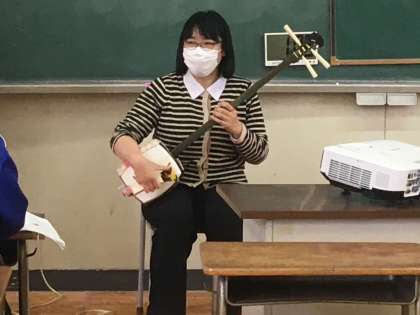 社会科で桃山文化を学習しました。安土桃山時代に、琉球の三線をもとに三味線が生まれ、次第に人々に普及しました。。三味線演奏が得意な教員に、富山県の民謡を演奏してもらいました。生徒は、「3本の弦しかないのいろいろな音がしてすごい」「音がなつかしい感じで昔にタイムスリップした感じがした」などと感想を書いていました。